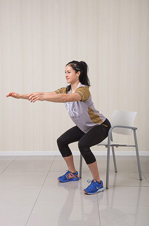 Este ejercicio clásico te ayuda a trabajar piernas y glúteos. Separa ligeramente las piernas y haz el gesto de sentarse, manteniendo el peso en los talones. La punta de los pies debe estar alineada con las rodillas, ni más abiertos ni más cerrados, para evitar lesiones. También se puede ejercitar teniendo como referencia una silla y apoyando ambas manos sobre la cintura.