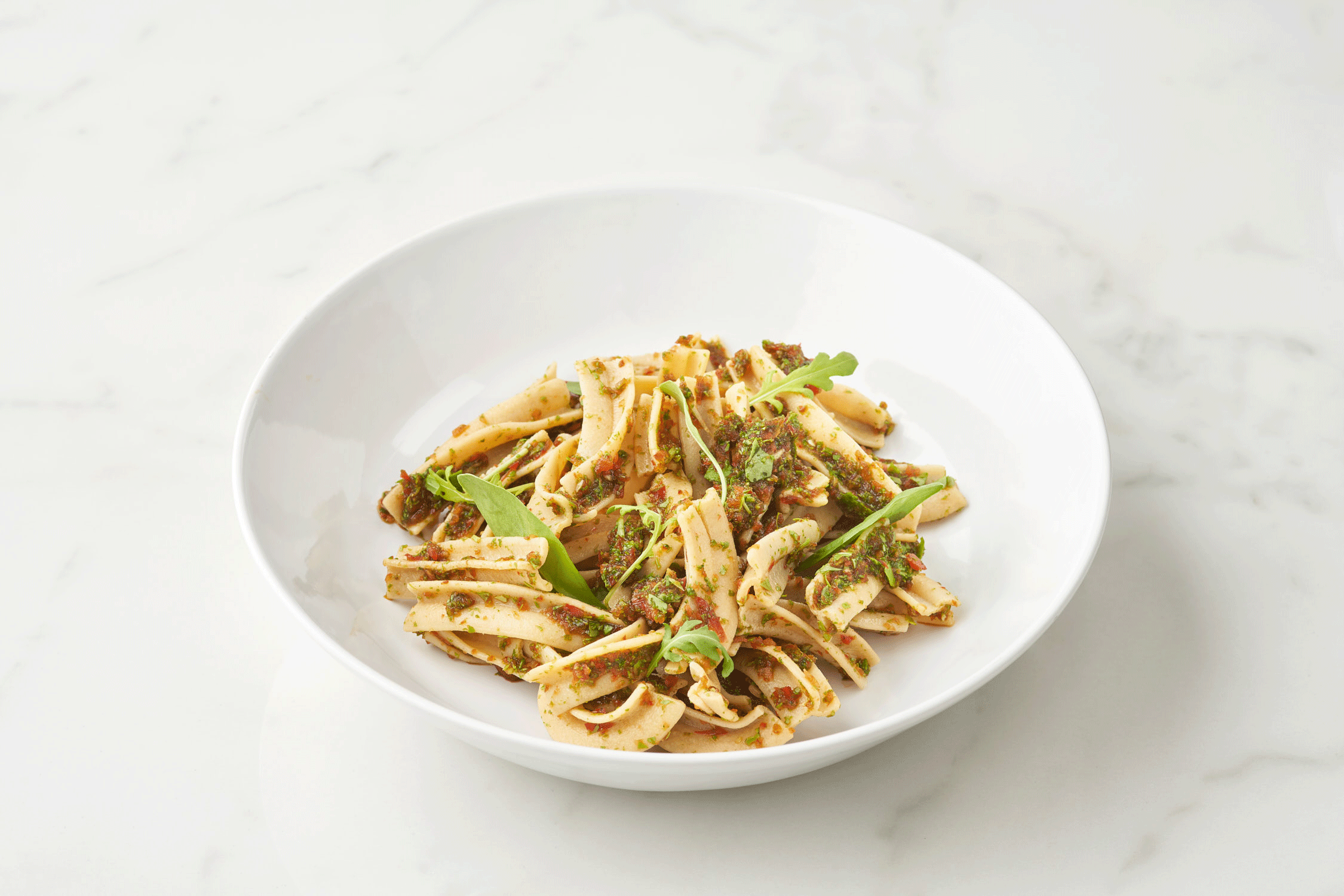 Pasta PnK con salsa pesto de rúcula, espinaca y pimiento rojo (Apta a partir del Paso 1)